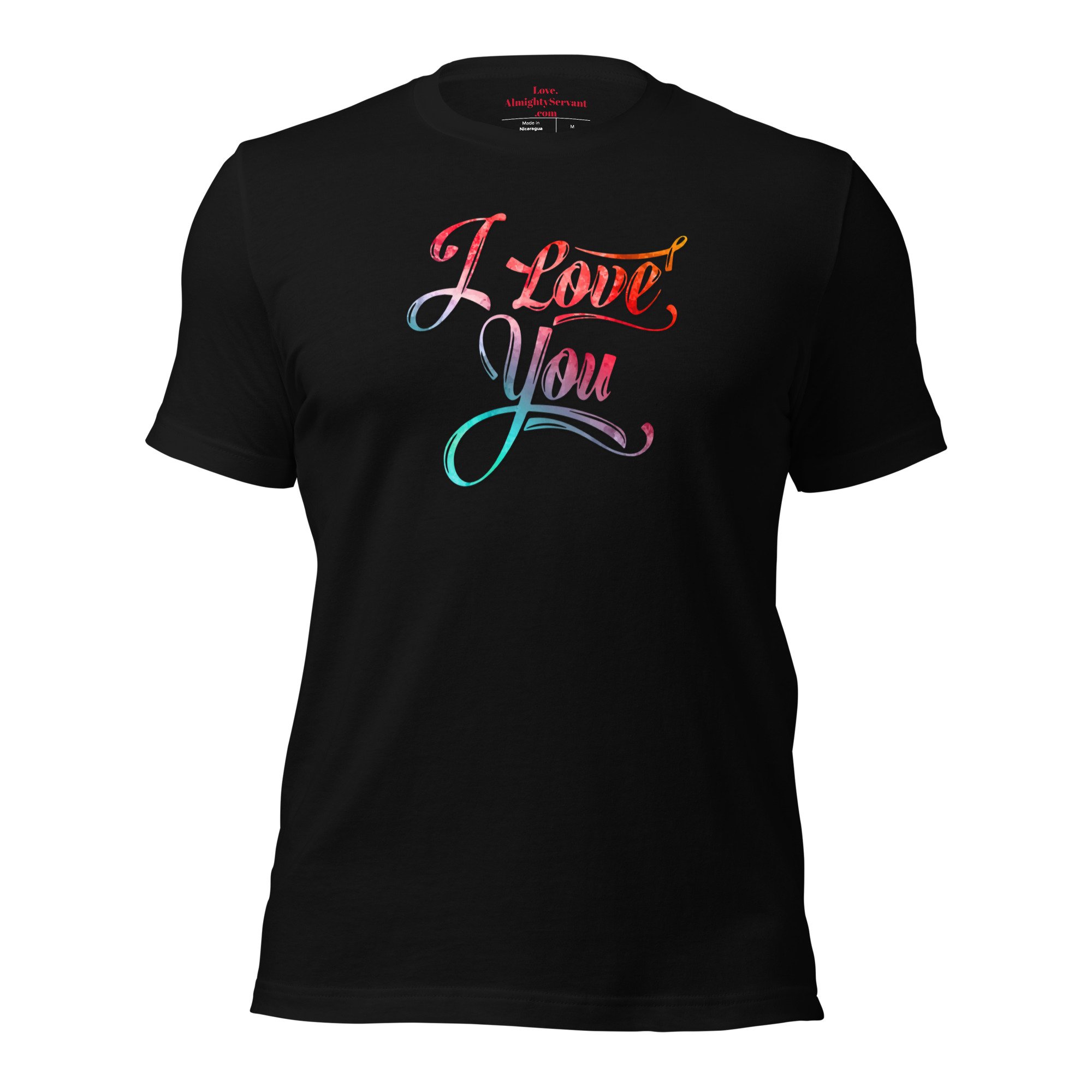 Spread love and positivity with our vibrant "I Love You" Unisex T-Shirt. Crafted with premium quality fabric, this comfortable t-shirt combines style and heartfelt expression. The multi-color font adds a touch of playfulness and joy to your everyday look. Wear it proudly and let the world know that love is the language we all understand. Perfect as a gift or for personal wear, this t-shirt is a symbol of love that transcends boundaries. Embrace the power of love and make a statement with our "I Love You" Unisex T-Shirt.